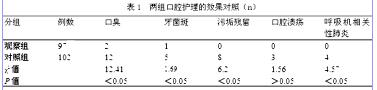 2.1 两组口腔护理的效果对照 两组口腔护理的效果对照详细见表1。