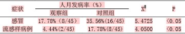 将观察组和对照组试验期间的人月发病率进行比较,观察组的感冒和流感样病例的人