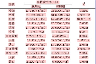 观察指标:观察期间,每位受试者家属每天均需认真填写是否发生了调查表格中感冒和流感样病例症状,每十天由专人收集一次表格。完成数据收集后,整理数据,分别计算两组的感冒、流感样病例及各种症状的人月患病率。