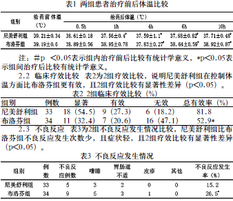 1.3 临床疗效标准 疗效标准:显效:用药6小时,体温下降>1℃;有效:用药6小时,体温下降1~0.5℃;无效:用药6小时,体温下降<0.5℃或体温上升。